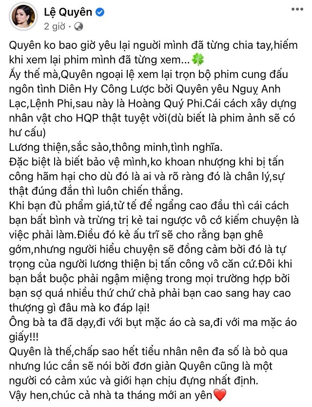 Tuy nhiên, Quyên là ngoại lệ khi xem lại toàn bộ phim Diên Hy Công Lược ngôn tình bởi Quyên yêu Ngụy Anh Lạc, Lệnh Phi, và sau này là Hoàng Quý Phi. Cách xây dựng nhân vật Hoàng Quý Phi thật tuyệt vời (dù biết phim sẽ hư cấu).